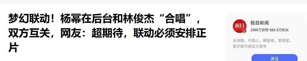 【1】极目新闻 2025-10-29 梦幻联动!杨幂在后台和林俊杰“合唱”,双方互关,网友:超期待,联动必须安排正片